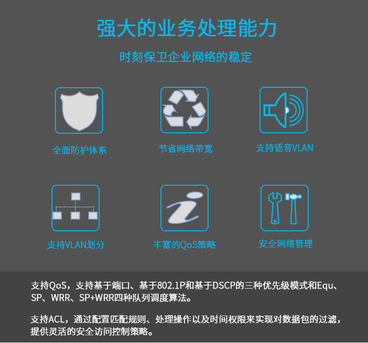 全面防護(hù)體系、節(jié)省網(wǎng)絡(luò)帶寬、支持語音VLAN、支持VLAN劃分、豐富的QoS策略、安全網(wǎng)絡(luò)管理。